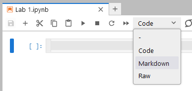 Cells can be switched between code and markdown using the cell type dropdown menu.