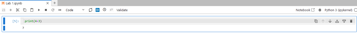 In the figure above, the code cell has the Python code print(4+3) entered. This cell has then been executed (see below), which “runs” the code in the cell: in this instance we add 4 and 3, and print the result.