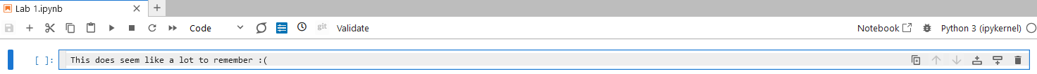 Each cell can consist of more than one line of input, which is not processed until the cell is executed, or “run”. You can run the currently active cell from the menu bar by clicking Cell → Run Cells, or by clicking on the “play” icon ▶ in the menu bar.