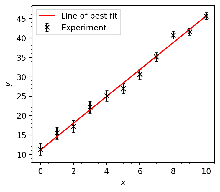 # Generate data for line of best fit# y = mx + cy_best_fit = opt_m * x + opt_cfig, ax = plt.subplots(figsize=(4, 3.5))# Plot data as markers with no lineax.errorbar(x, y, y_err, fmt='kx', capsize=2., label='Experiment')ax.plot(x, y_best_fit, label='Line of best fit', color='r')# Set axis labelsax.set_xlabel(r'$x$')ax.set_ylabel(r'$y$')# Enable minor ticksax.minorticks_on()# Add legend boxax.legend()fig.tight_layout()plt.show()