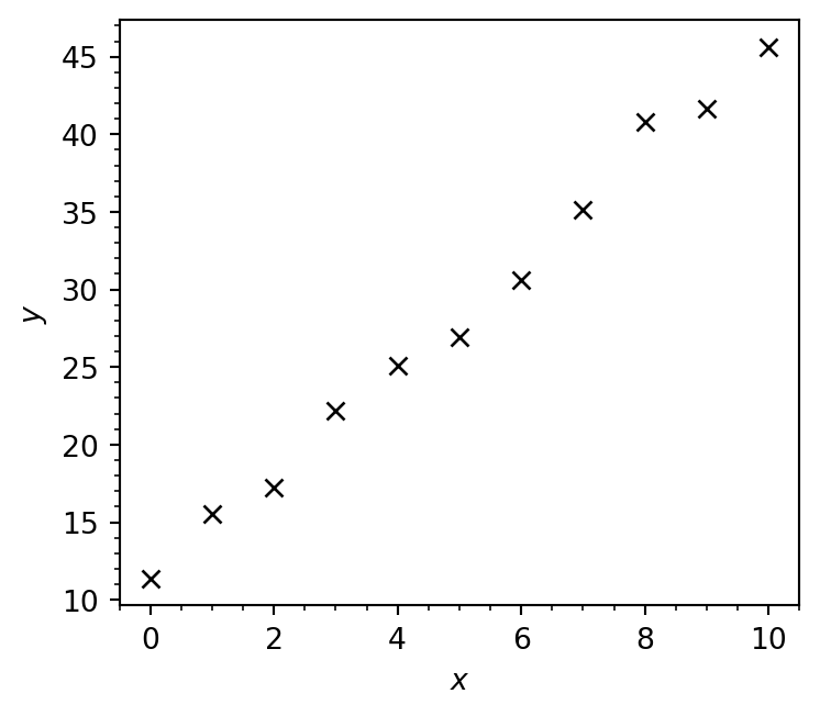 import matplotlib.pyplot as pltimport numpy as np%config InlineBackend.figure_format='retina'# Load linear.csv into two arraysx, y = np.loadtxt('linear.csv', delimiter=',', unpack=True)fig, ax = plt.subplots(figsize=(4, 3.5))# Plot data as markers with no lineax.plot(x, y, marker='x', lw=0, color='k')# Set axis labelsax.set_xlabel(r'$x$')ax.set_ylabel(r'$y$')# Enable minor ticksax.minorticks_on()fig.tight_layout()plt.show()