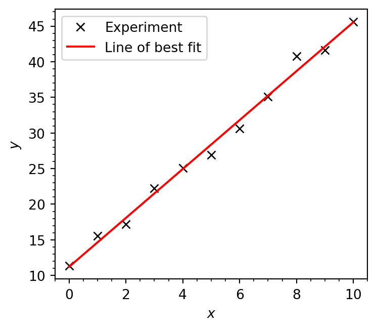 # Generate data for line of best fit# y = mx + cy_best_fit = regression_data.slope * x + regression_data.interceptfig, ax = plt.subplots(figsize=(4, 3.5))# Plot data as markers with no lineax.plot(x, y, marker='x', lw=0, label='Experiment', color='k')# Plot line of best fitax.plot(x, y_best_fit, label='Line of best fit', color='r')# Set axis labelsax.set_xlabel(r'$x$')ax.set_ylabel(r'$y$')# Enable minor ticksax.minorticks_on()# Add legend boxax.legend()fig.tight_layout()plt.show()