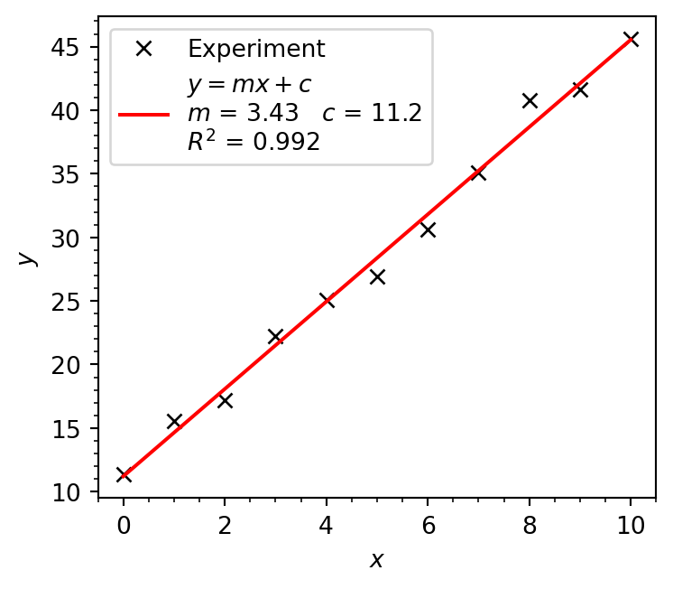 # Generate data for line of best fit# y = mx + cy_best_fit = regression_data.slope * x + regression_data.interceptfig, ax = plt.subplots(figsize=(4, 3.5))# Plot data as markers with no lineax.plot(x, y, marker='x', lw=0, label='Experiment', color='k')# Make label for line of best fitlobf_label =r'$y = mx+c$'lobf_label +='\n'+'$m$ = '+f'{regression_data.slope:.3g} 'lobf_label +=r'$c$ = '+f'{regression_data.intercept:.3g}'+'\n'lobf_label +='$R^2$ = '+f'{regression_data.rvalue**2:.3g}'# Plot line of best fitax.plot(x, y_best_fit, label=lobf_label, color='r')# Set axis labelsax.set_xlabel(r'$x$')ax.set_ylabel(r'$y$')# Enable minor ticksax.minorticks_on()# Add legend boxax.legend()fig.tight_layout()plt.show()