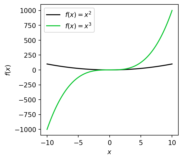 ax.plot(x, x ** 3, label=r'$f(x) = x^3$', color='#0cc631')