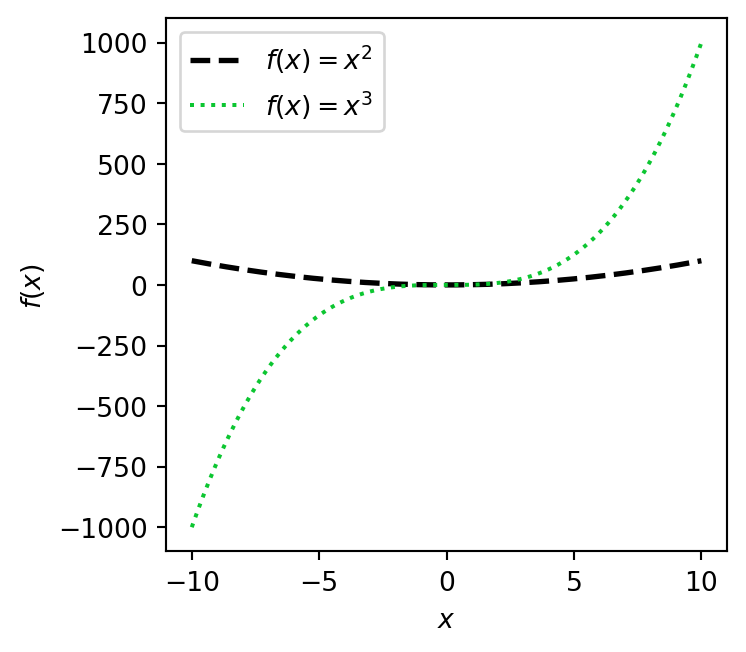 ax.plot(x, x ** 3, label=r'$f(x) = x^3$', color='#0cc631', ls=':')