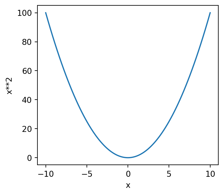 The first two lines will be familiar to you from Session 5. We create an array of 100 evenly spaced values between -10 and 10 using np.linspace(), and then we calculate the corresponding \(x^2\) values by squaring each element in the x array.