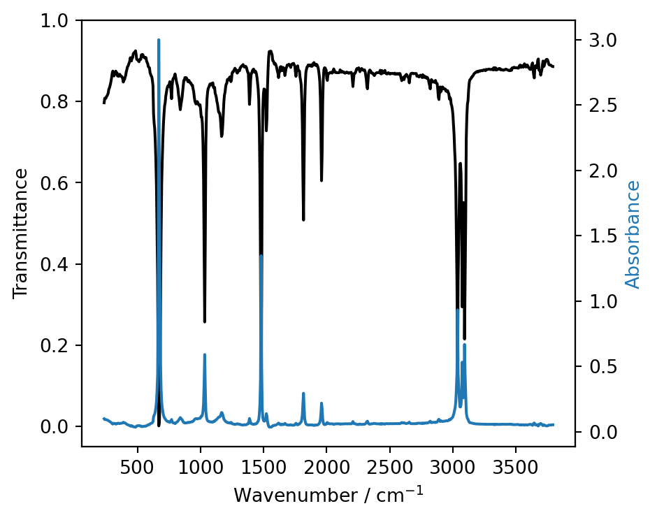 import matplotlib.pyplot as pltimport numpy as np%config InlineBackend.figure_format='retina'# Load the infrared data from filewavenumber, transmittance, absorbance = np.loadtxt('water_ir_spectrum.dat', unpack=True, skiprows=1)# Create the figure and the axesfig, ax = plt.subplots(figsize=(5, 4))ax.plot(wavenumber, transmittance, color='k', label='Transmittance')ax.set_xlabel(r'Wavenumber / cm$^\mathregular{-1}$')ax.set_ylabel('Transmittance')# Set axis limits and enable minor ticksax.set_ylim(-0.05, 1)# Create twinned axis for absorbance# Twinx means they will share the x axis but have different y scalesaax = ax.twinx()# Plot absorbance data onto new twinned axisaax.plot(wavenumber, absorbance, color='C0', label='Absorbance')# Set y label for twinned axis with same color as the lineaax.set_ylabel('Absorbance', fontdict={'color': 'C0'})fig.tight_layout()plt.show()
