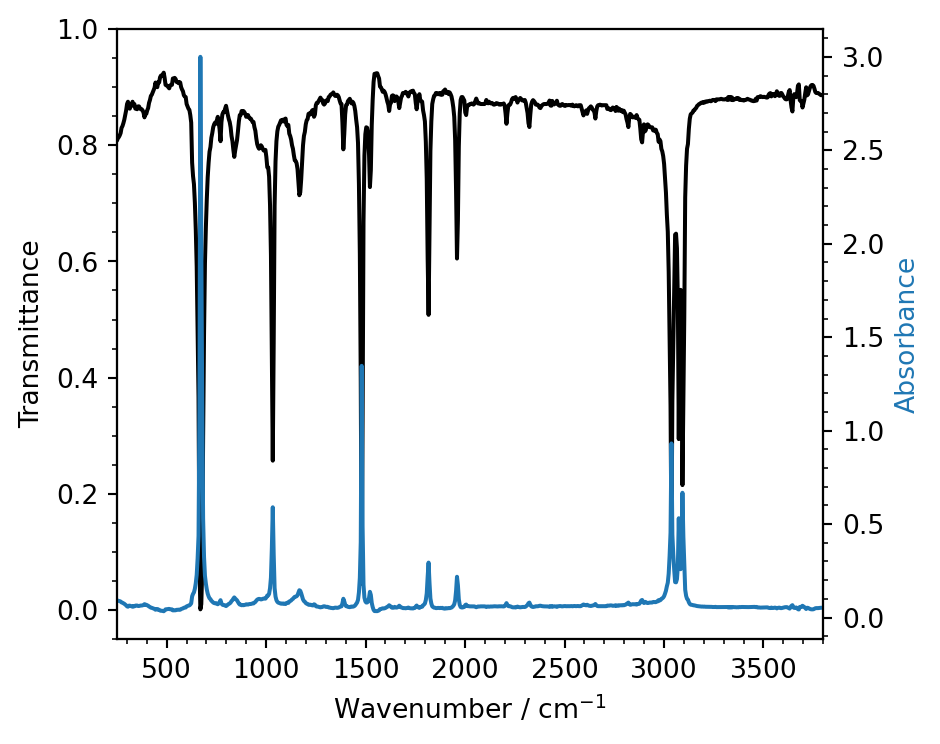 # Load the infrared data from filewavenumber, transmittance, absorbance = np.loadtxt('water_ir_spectrum.dat', unpack=True, skiprows=1)# Create the figure and the axesfig, ax = plt.subplots(figsize=(5, 4))ax.plot(wavenumber, transmittance, color='k', label='Transmittance')ax.set_xlabel(r'Wavenumber / cm$^\mathregular{-1}$')ax.set_ylabel('Transmittance')# Set axis limits and enable minor ticksax.set_ylim(-0.05, 1)ax.set_xlim(250, 3800)ax.minorticks_on()# Create twinned axis for absorbance# Twinx means they will share the x axis but have different y scalesaax = ax.twinx()# Plot absorbance data onto new twinned axisaax.plot(wavenumber, absorbance, color='C0', label='Absorbance')# Set y label for twinned axis with same color as the lineaax.set_ylabel('Absorbance', fontdict={'color': 'C0'})# Add minor ticksaax.minorticks_on()fig.tight_layout()plt.show()