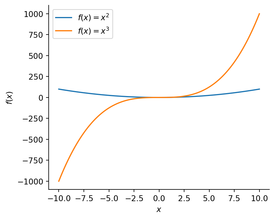 from matplotlib.ticker import MultipleLocator# 1000 linearly spaced values between -10 and 10x = np.linspace(-10, 10, 1000)# Create the figure and the axesfig, ax = plt.subplots(figsize=(5, 4))# Plot the data, and provide a label for each plot with custom coloursax.plot(x, x **2, label=r'$f(x) = x^2$')ax.plot(x, x **3, label=r'$f(x) = x^3$')# Remove right and upper spines# these are the "outlines" of the axisax.spines['top'].set_visible(False)ax.spines['right'].set_visible(False)# Set the axis labelsax.set_xlabel(r'$x$')ax.set_ylabel(r'$f(x)$')# Turn on the legendax.legend()# Tighten the layoutfig.tight_layout()# Show the plotplt.show()