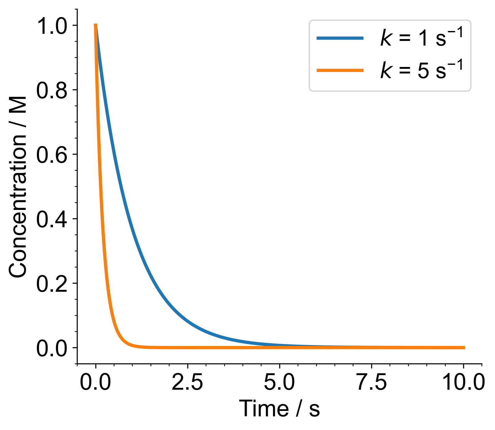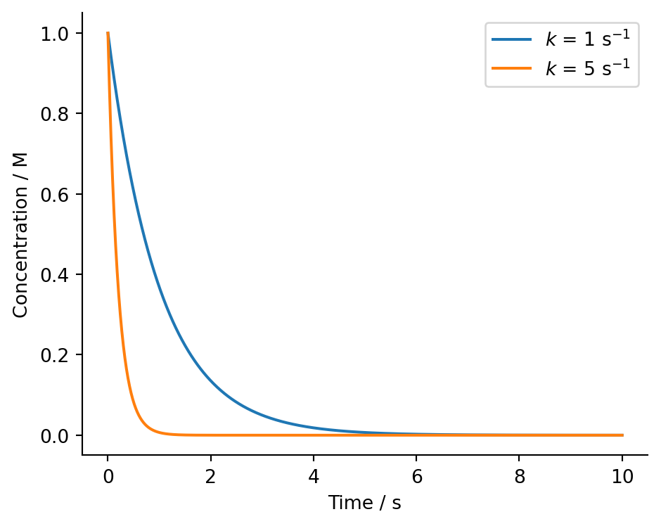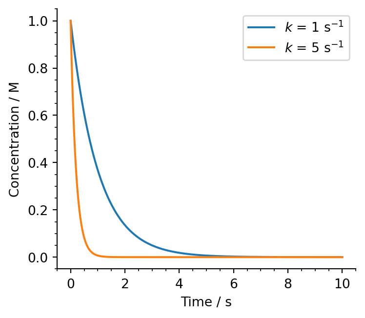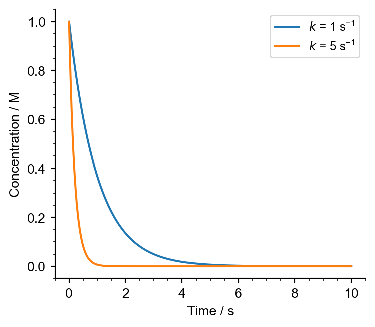from matplotlib.ticker import MultipleLocator# Time values 0 to 10 secondst = np.linspace(0, 10, 1000)# 1st order rate constantsk1 =1# s^{-1}k2 =5# s^{-1}# Initial concentrationc0 =1# M# Concentrations as fn of time for two rate constantsconc_1 = c0 * np.exp(-k1 * t) # Mconc_2 = c0 * np.exp(-k2 * t) # M# Create the figure and the axesfig, ax = plt.subplots(figsize=(5, 4))# Plot the data, and provide a label for each plot with custom coloursax.plot(t, conc_1, label=r'$k$ = 1 s$^\mathregular{-1}$')ax.plot(t, conc_2, label=r'$k$ = 5 s$^\mathregular{-1}$')# Remove right and upper spines# these are the "outlines" of the axisax.spines['top'].set_visible(False)ax.spines['right'].set_visible(False)# Set the axis labelsax.set_xlabel(r'Time / s')ax.set_ylabel(r'Concentration / M')# Turn on the legendax.legend()# Tighten the layoutfig.tight_layout()# Show the plotplt.show()
