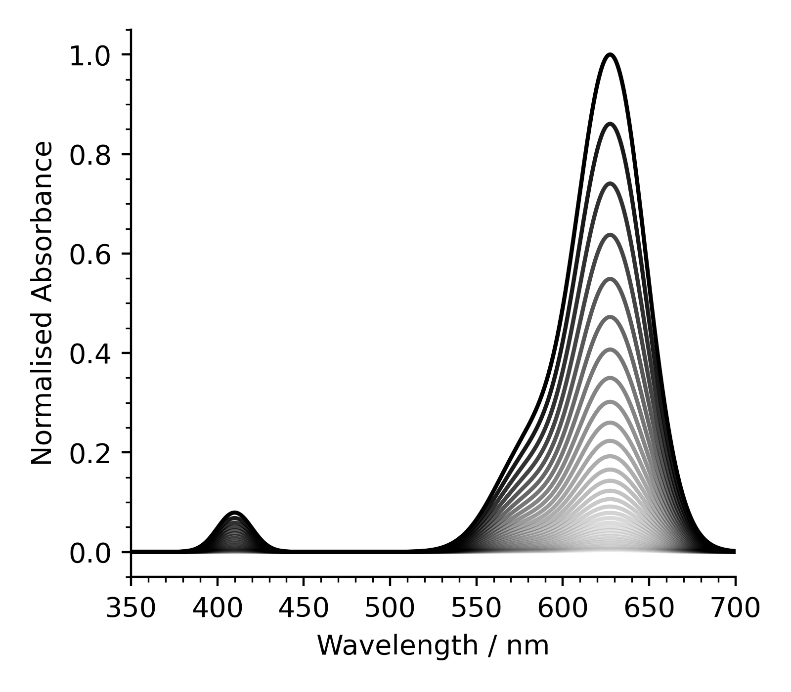 We have a strong signal at \(627 \mathrm{\ nm}\), this is the one we’ll track over the course of the reaction.