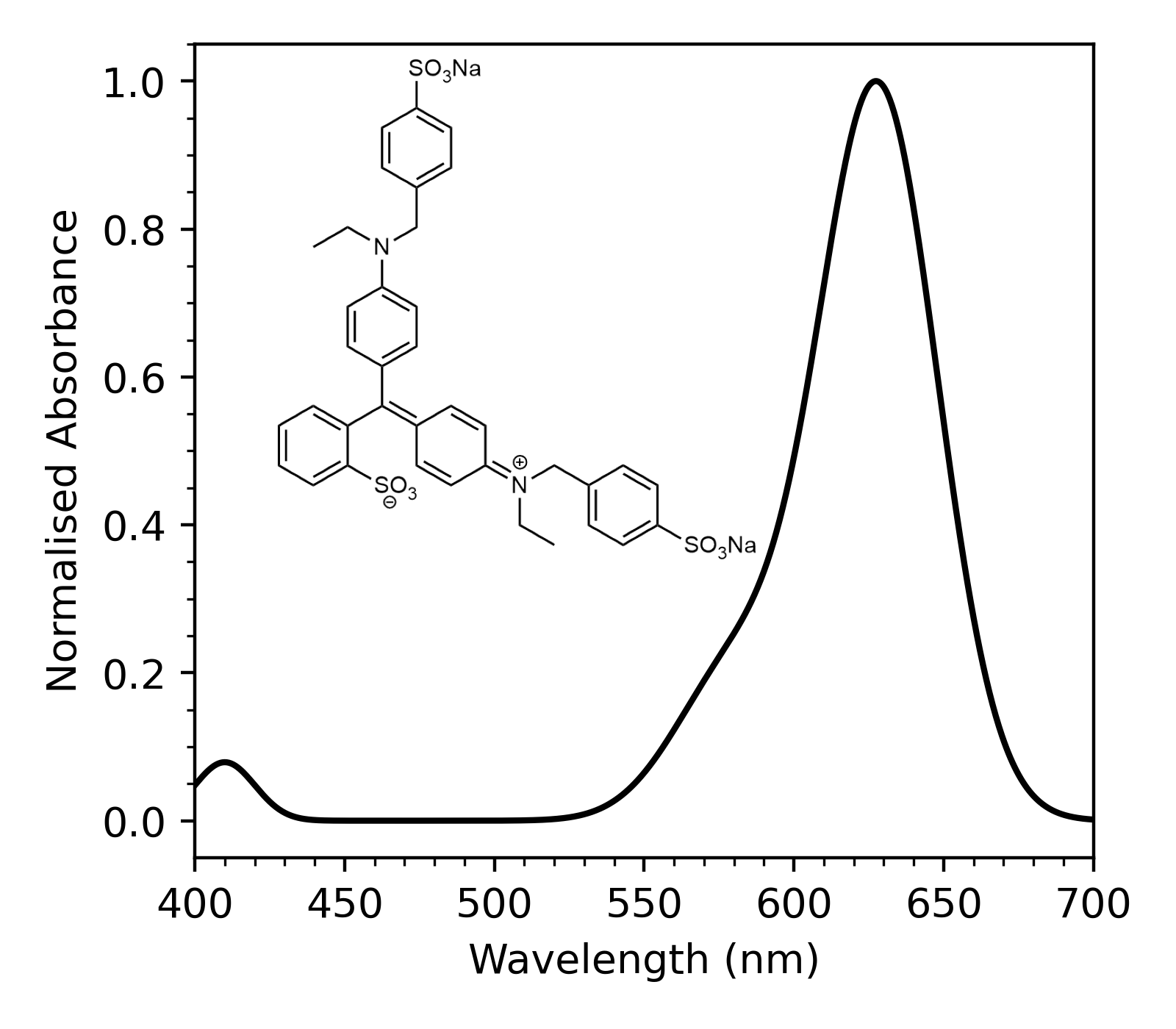 Blue-1 is a water-soluble dye which has been used in food, drugs, and cosmetics due to its vibrant blue colour. The UV-Visible spectrum of Blue-1 contains an intense peak at \(627\, \mathrm{nm}\).