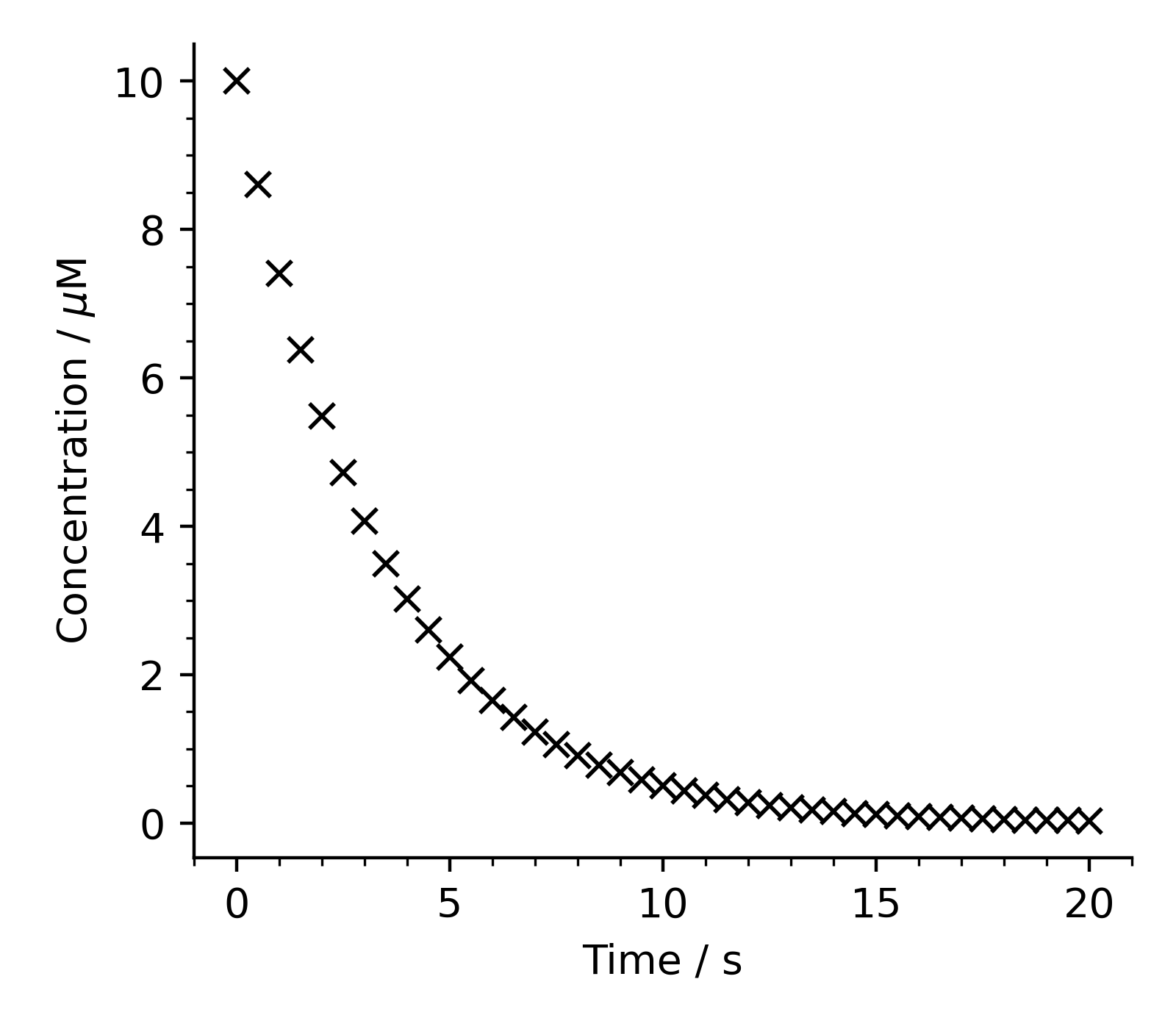 You have been provided with 41 .csv files, each containing a single spectrum recorded at a specific point of time during the reaction, where the time value is stored in the file name. For example, t_0p5.csv corresponds to \(t = 0.5 \mathrm{\ s}\), i.e. the p means decimal point. The spectra you have been given have been recorded from \(t=0 \mathrm{\ s}\) to \(t=20 \mathrm{\ s}\) in steps of \(0.5\mathrm{\ s}\).